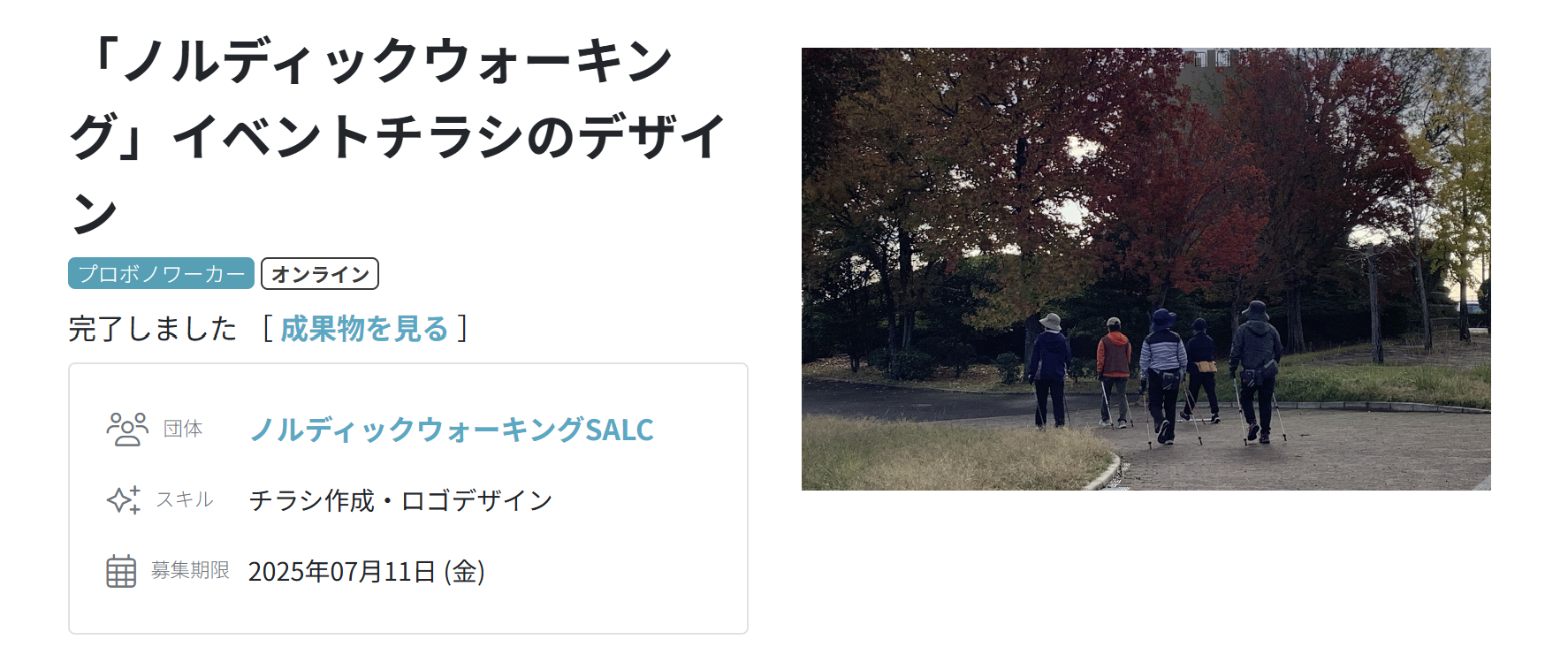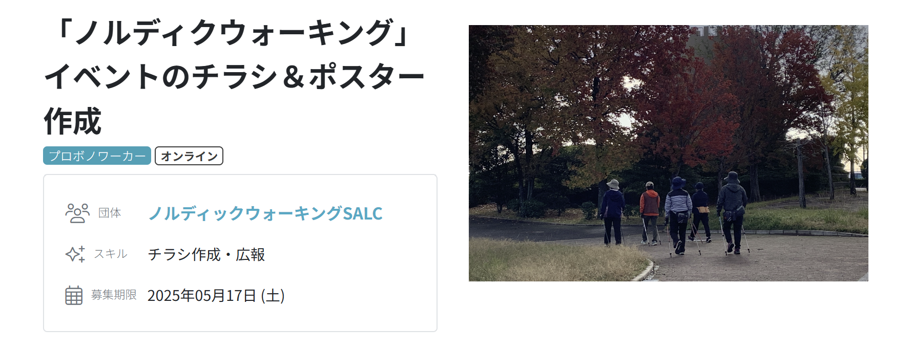 次に検討したプロジェクトは「「ノルディックウォーキング」イベントのチラシ&ポスター作成」です。