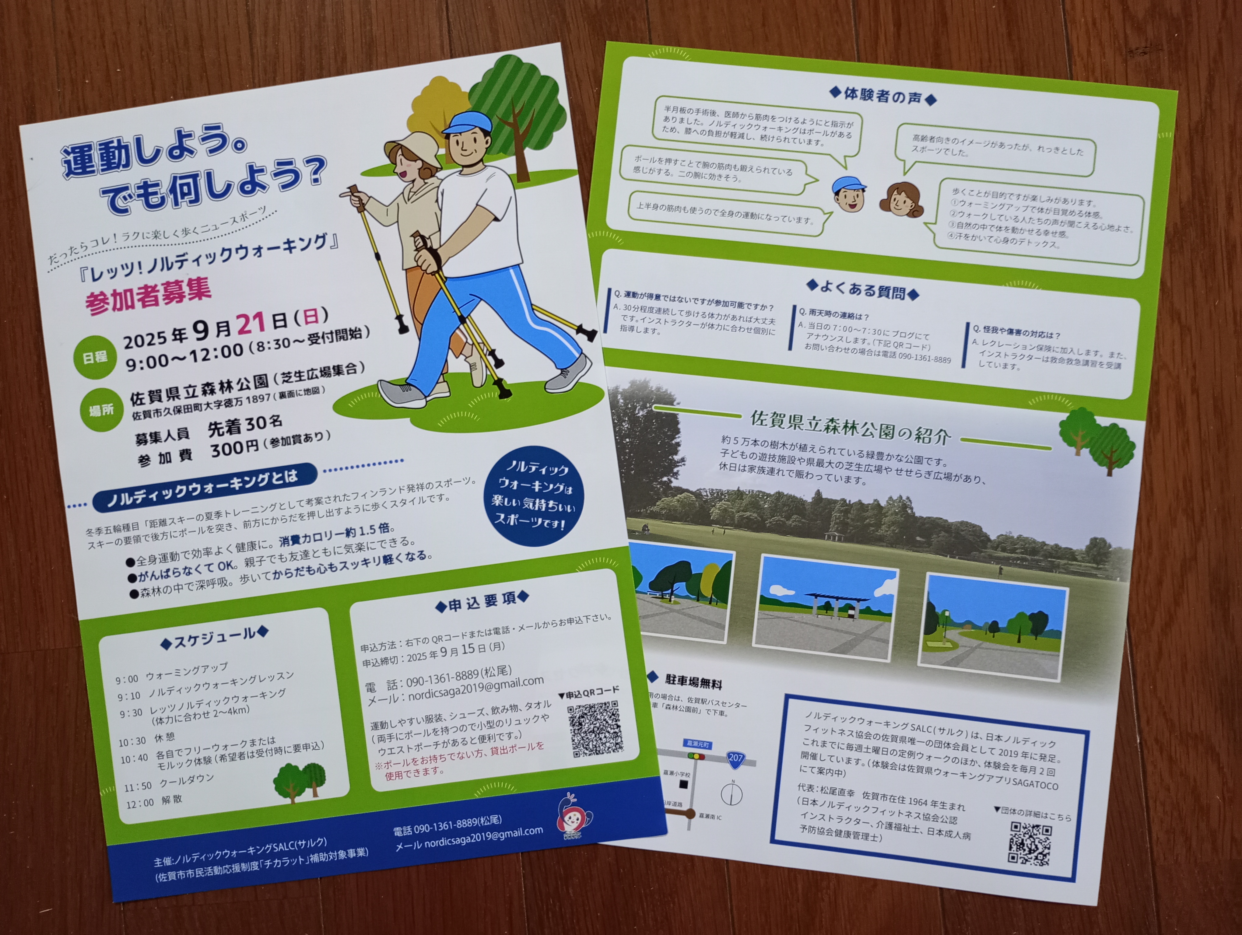 今年度の佐賀市の補助対象事業に応募して採択され、ノルディックウォーキングのイベントを実施することになりました。採択が決まったのは3月で、チラシは当初からGRANTで募集しようと考えていました。