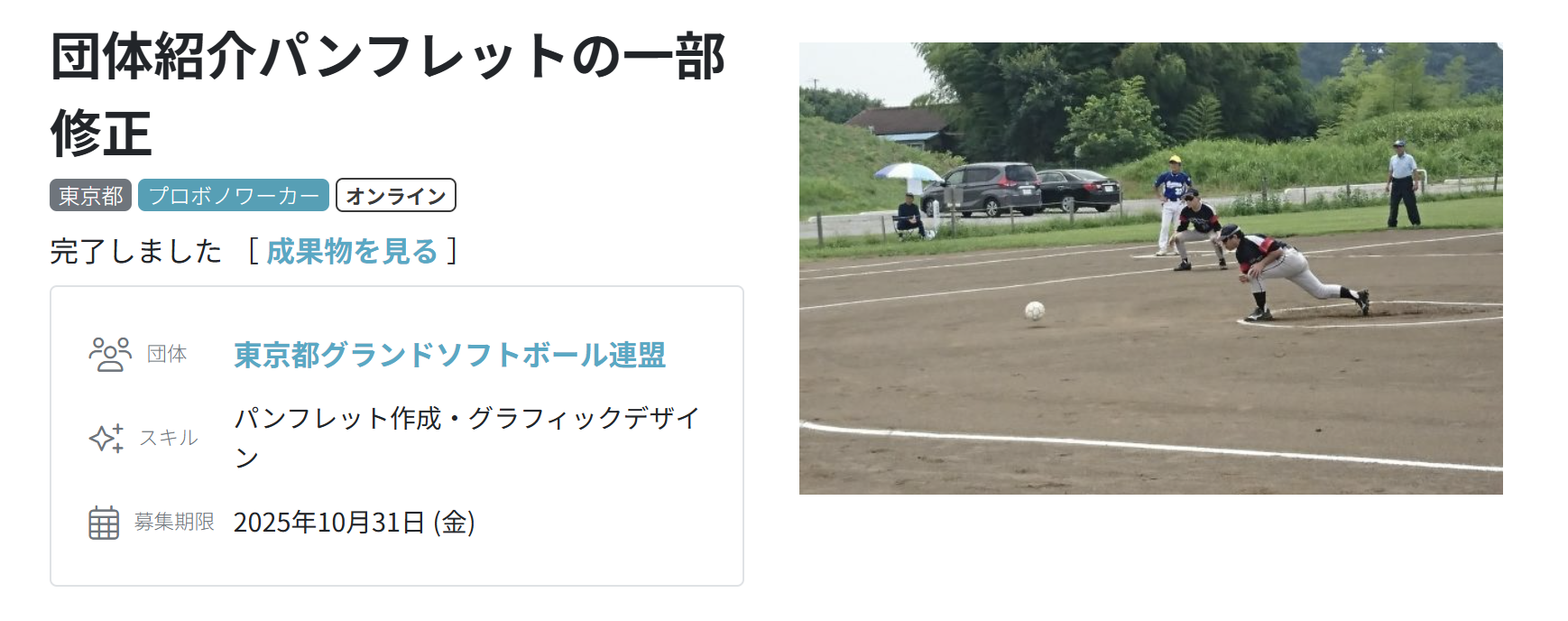 その中で、東京都ブラインドベースボール連盟(旧称:東京都グランドソフトボール連盟)さんの「団体紹介パンフレットの一部修正」というプロジェクトに目が留まったのは、それが「ゼロからの新規作成」ではなく「既存データの修正」だったからです。これなら、初めての私でもベースがある分、手を挙げやすいと感じました。