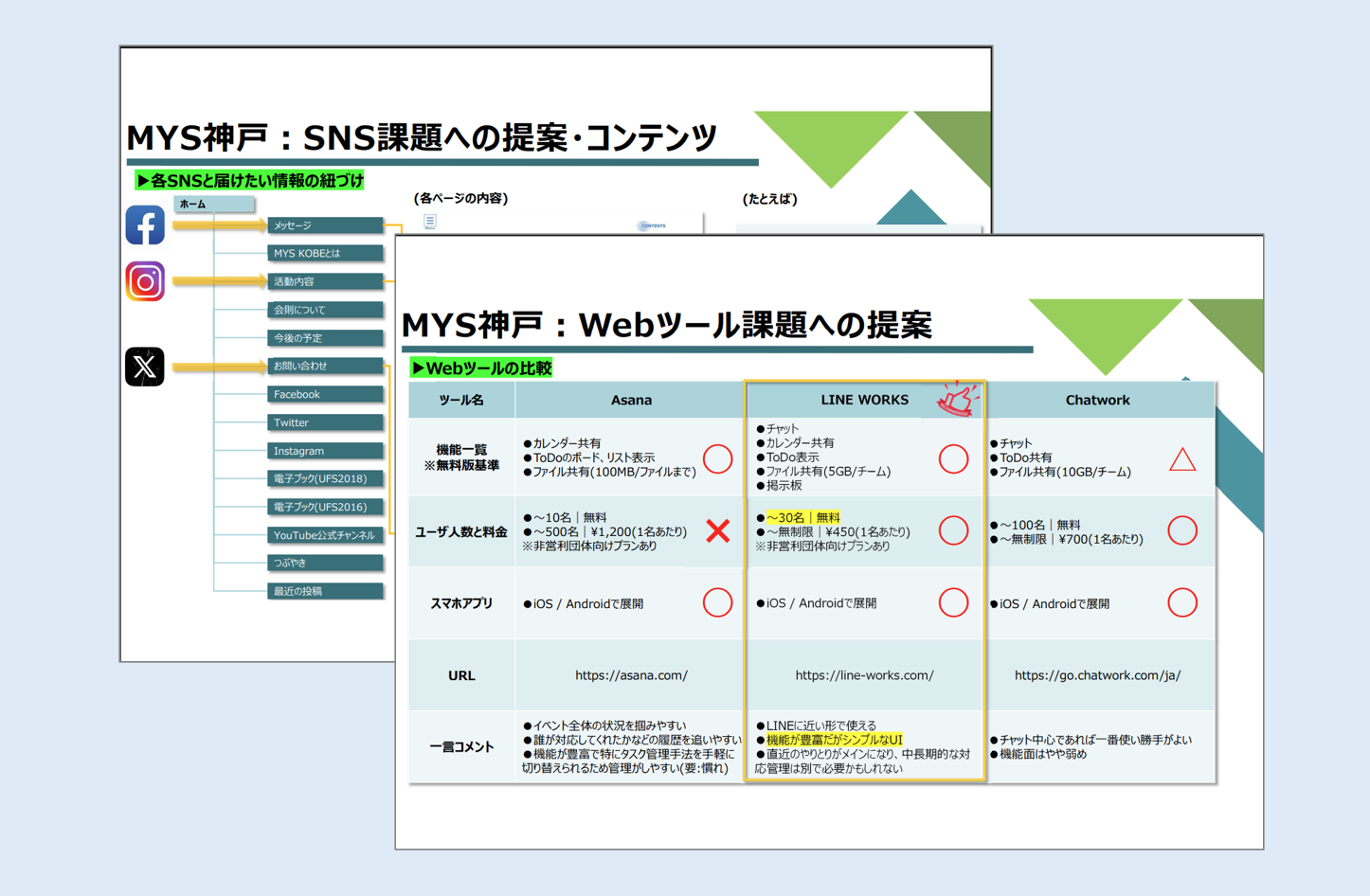 最初のプロジェクト終了後に団体がKOBEプロボノ・コミュニティの「壁打ち会」に参加し、その後、イベントの営業資料作成を手伝ってほしいという依頼となりました。プロジェクトは3回のミーティングで完成させる形で進めました。