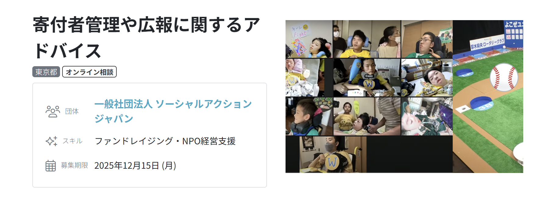 一般社団法人ソーシャルアクションジャパンは、重い障がいや病気があっても選手として活躍できる「ウルトラ・ユニバーサル野球」の主催・大会運営を行っている団体です。2025年5月に団体設立後すぐにGRANTに登録し、複数のプロジェクトを実施しました。